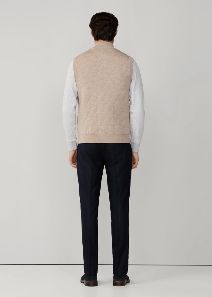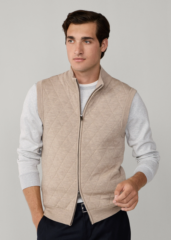Šviesios spalvos šilta dygsniuota liemenė užsegama dvigubu užtrauktuku. Aukšta apykaklė.