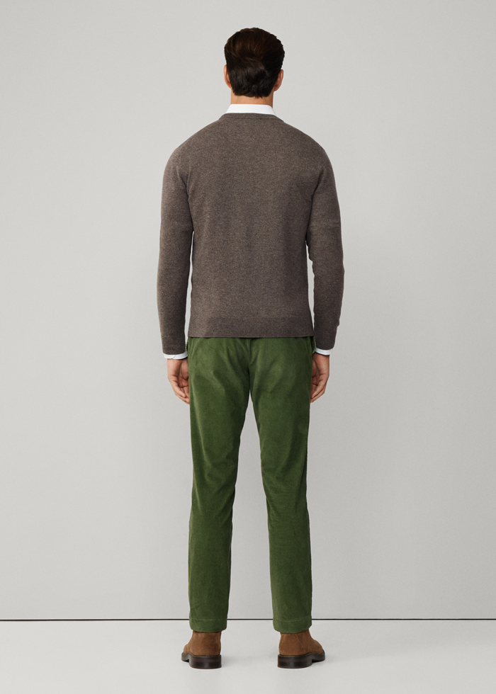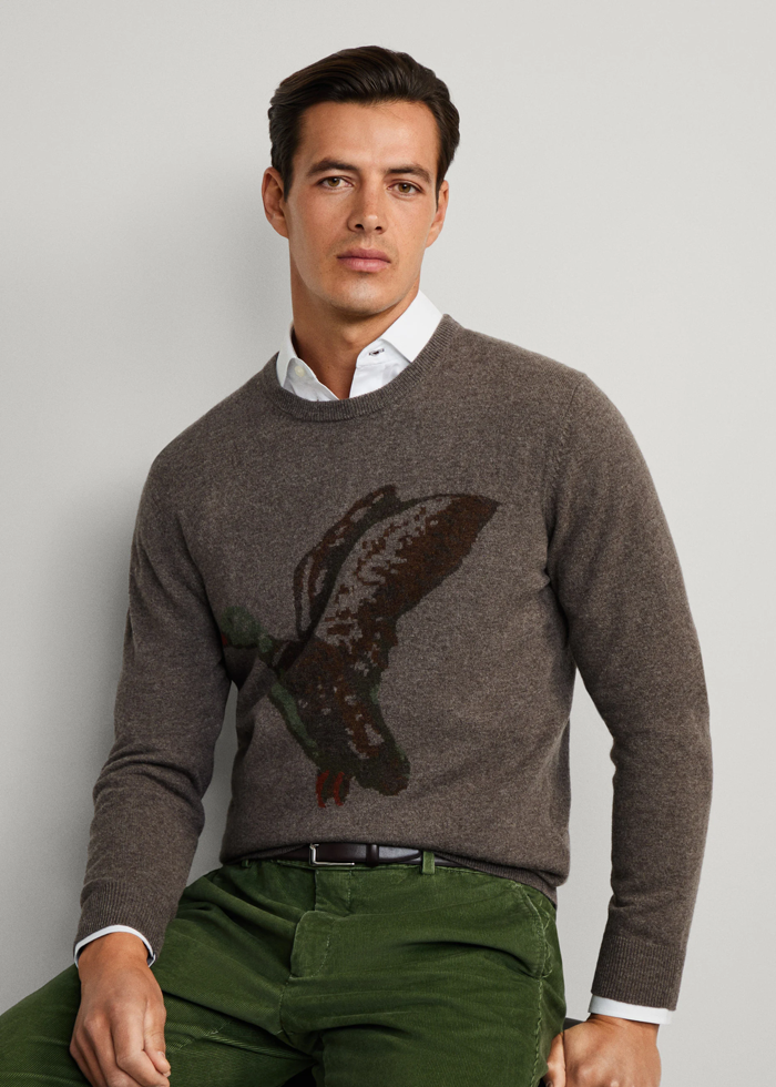 Tamsiai rudos spalvos vilnos audinio megztinis ilgomis rankovėmis. Apvali kaklo iškirptė.