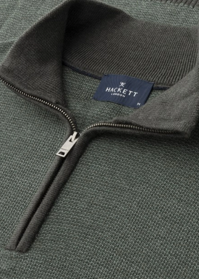 Tamsiai žalios spalvos klasikinis džemperis ilgomis rankovėmis. Užtrauktuku užsegama apykaklė.