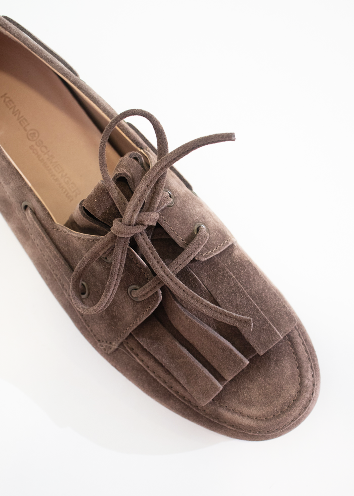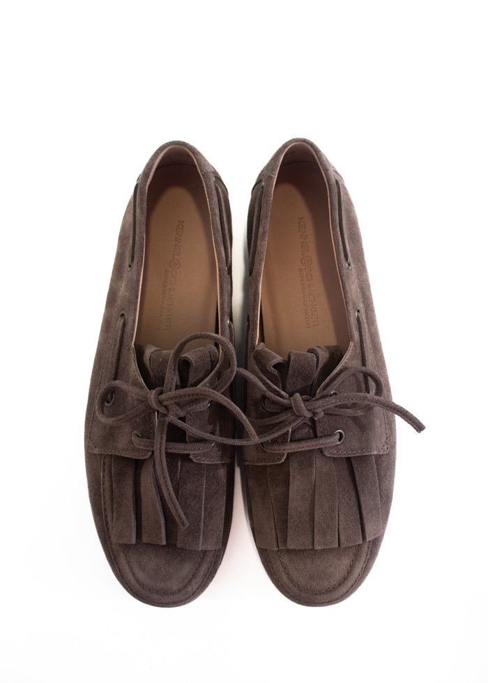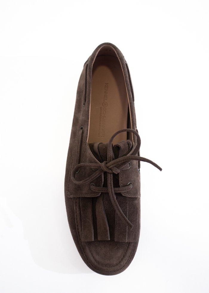 Tamsiai rudos spalvos verstos odos klasikiniai mokasinai bateliai. Surišami priekyje odiniu raišteliu. Apvali noselė.