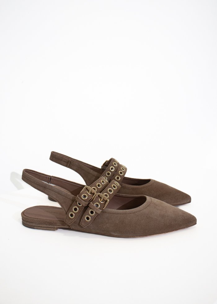 Verstos odos elegantiškos atvirakulnės basutės smailėjančia nosele. Užsegamos reguliuojamais dirželiai su aukso spalvos furnitūra. Elastinis užkulnis.