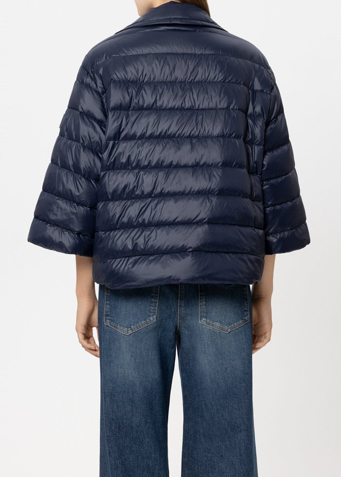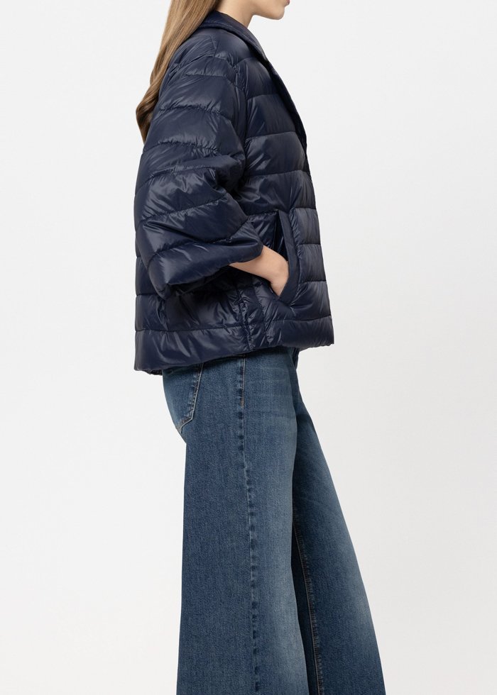 Dygsniuota pūkinė striukė iš lengvo, lauko sąlygoms skirto nailono, laisvo, „cape“ tipo silueto, su atlapų apykakle ir plačiomis, trumpintomis rankovėmis. Modelis turi centrinę spaudžių juostą, du šoninius skeltukus su spaudėmis, reguliuojamą raištelį apačioje, dvi atviras šonines kišenes ir vieną vidinę kišenę.