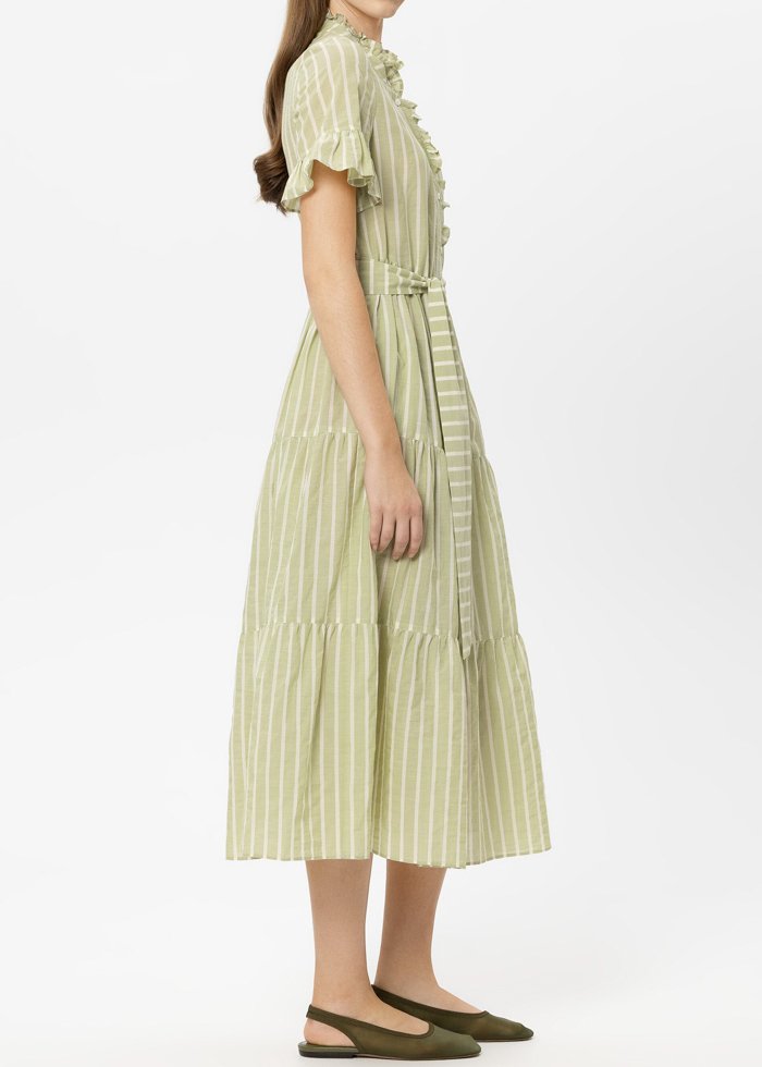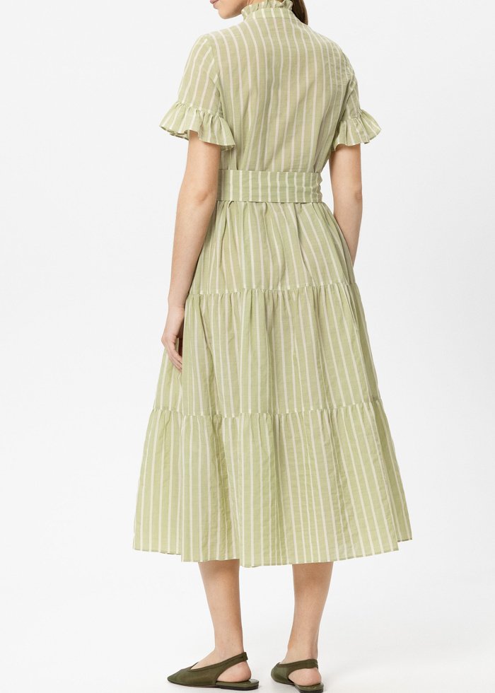 Ilga, platėjanti marškinių tipo suknelė iš lengvo medvilninio audinio, dekoruota dryžuotu raštu, su pusine sagų juosta ir raukiniuota sijono apačia. Trumpos rankovės ir stovelio formos apykaklė užbaigtos raukiniais. Liemenį galima pabrėžti surišamu dirželiu.