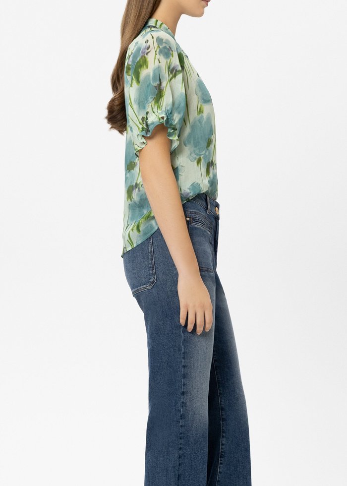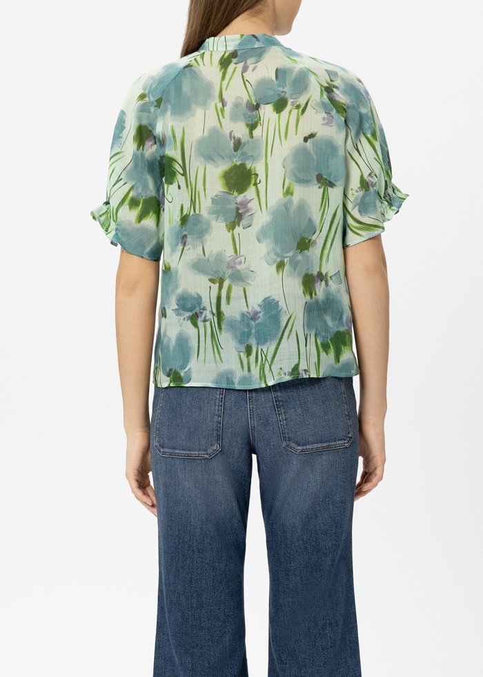 Palaidinė trumpomis rankovėmis iš pusiau permatomo liocelio ir ramės mišinio, dekoruota grafiniu gėlių raštu. Per visą ilgį einanti sagų juosta ir raukiniai rankovių galuose suteikia modeliui romantiško žavesio.