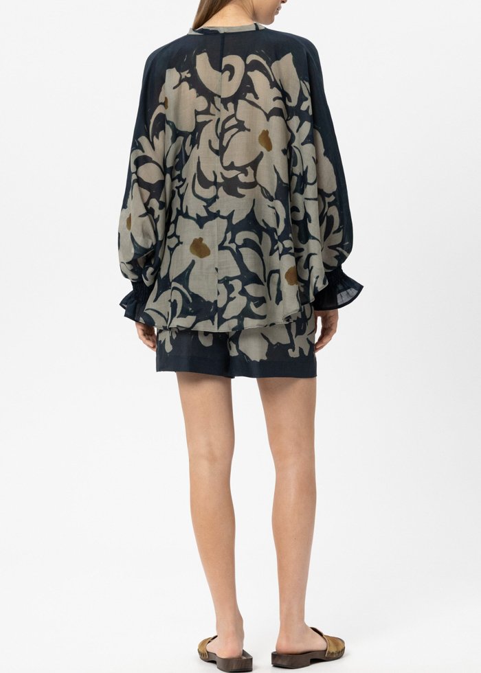 Pusiau permatoma palaidinė iš liocelio ir ramės mišinio, dekoruota išskirtiniu ornamentiniu gėlių raštu. Modelis pasižymi išraiškingu „cape“ tipo siluetu, atvira iškirpte su atvartu ir rauktais, elastiniais rankogaliais.
