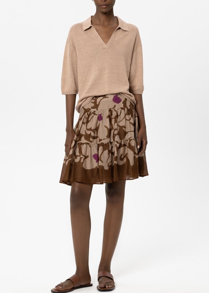 Tunikos tipo palaidinė iš grynos medvilnės su V formos iškirpte ir klosčių detalėmis. Modelis su pailginta nugaros dalimi, o kimono tipo rankovės dekoruotos ažūrine siuvinėjimo technika ir pritvirtintais gėlių motyvais.