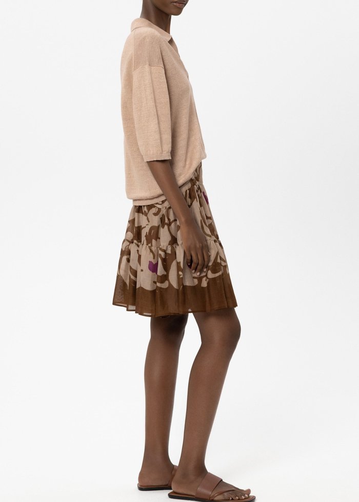 Trumparankovis megztas polo iš plonų itališko lino siūlų, pasižymintis minkštu, švelniai blizgiu paviršiumi. Modelis su klasikine polo apykakle, atvira iškirpte ir siaurais rumbuotais rankogaliais, išlaikantis švarų, minimalistinį dizainą.