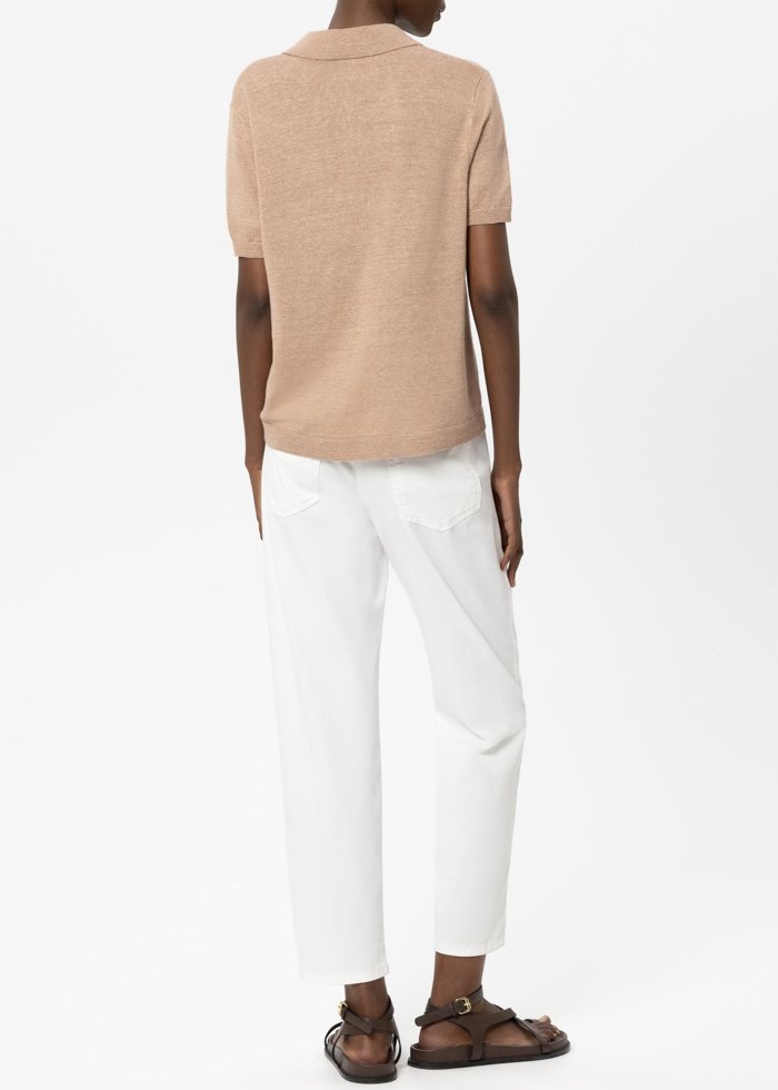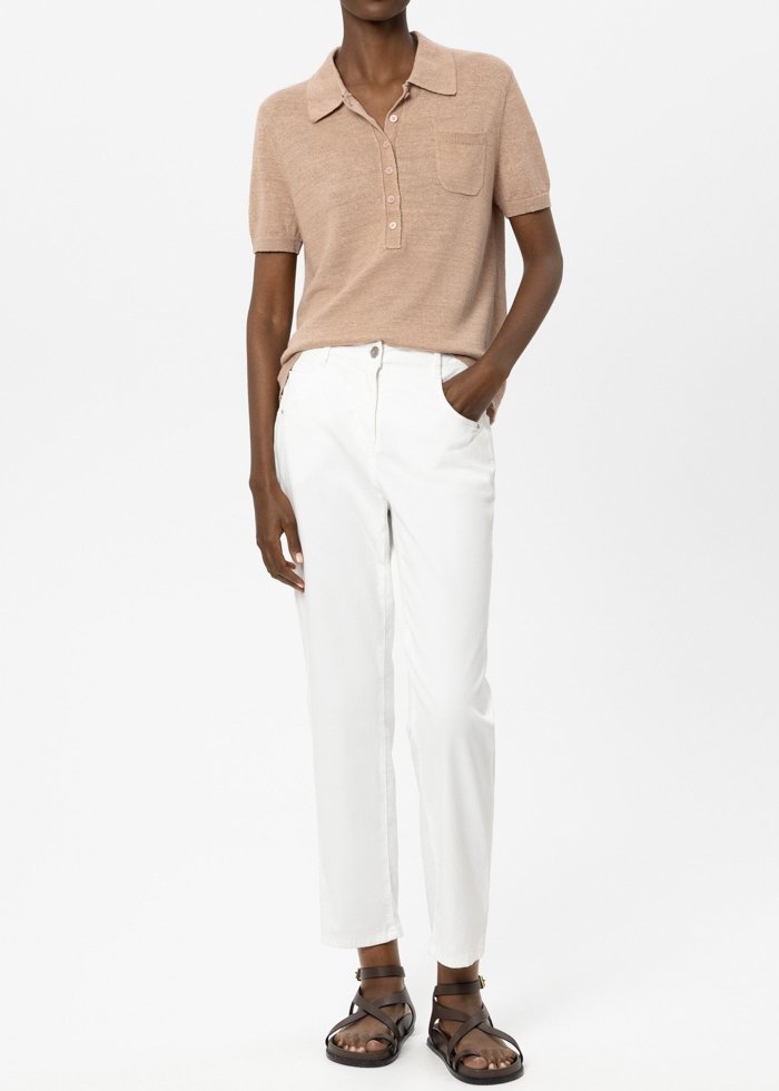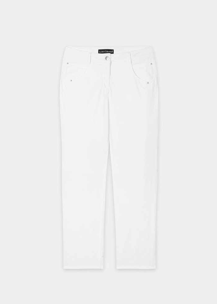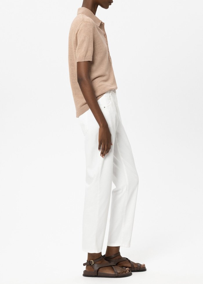 Siaurėjančio silueto kelnės iš blizgaus, matinio atspalvio džinso su patogiu tamprumo kiekiu. Modelis – klasikinio penkių kišenių dizaino, su diržo kilpomis ir užsegimu saga bei užtrauktuku.