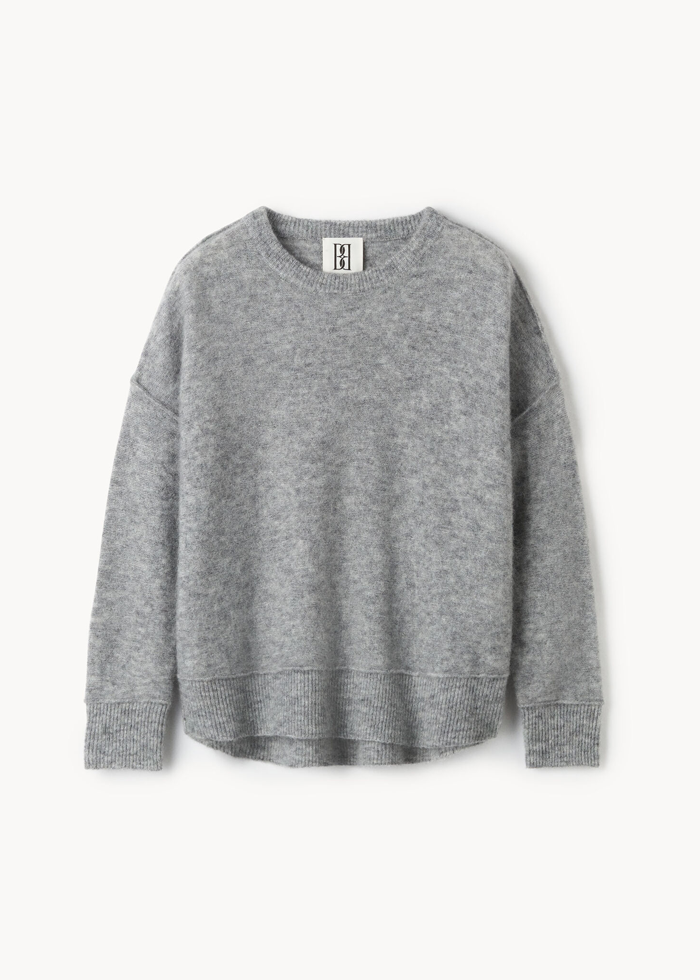 Pelenų rožės spalvos laisvo silueto megztinis ilgomis rankovėmis. Aukšta apykaklė. Nuleista pečių juosta.