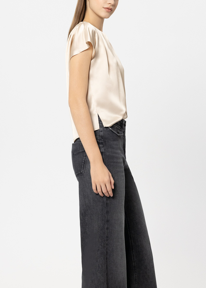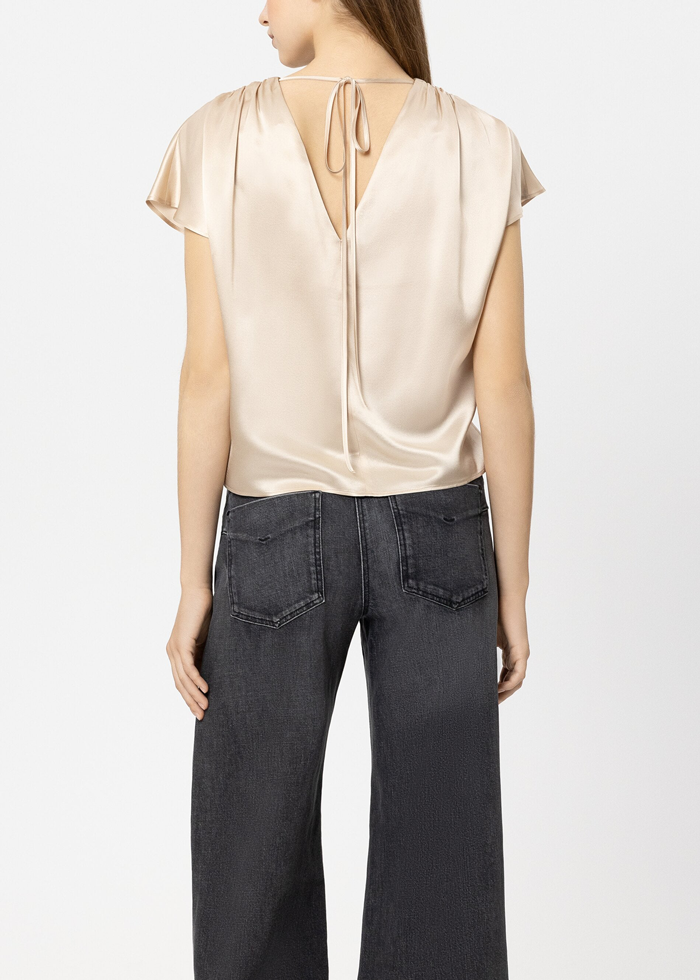 Minkštos karamelės spalvos šilko audinio palaidinė trumpomis rankovėmis. Apvali kaklo iškirptė, surišama nugaroje. Skeltukai šonuose.