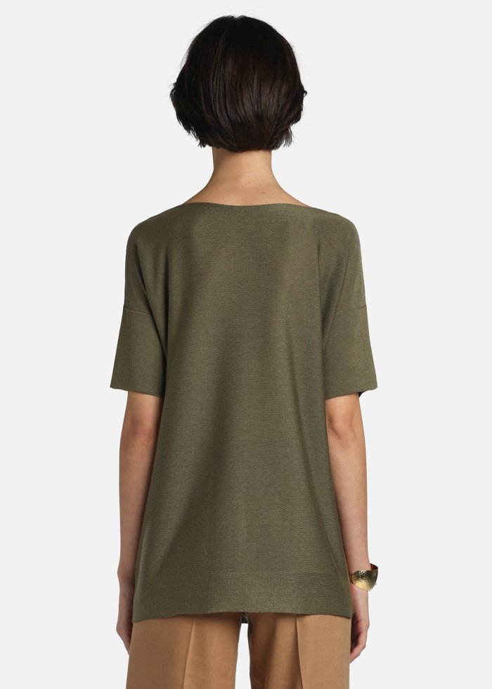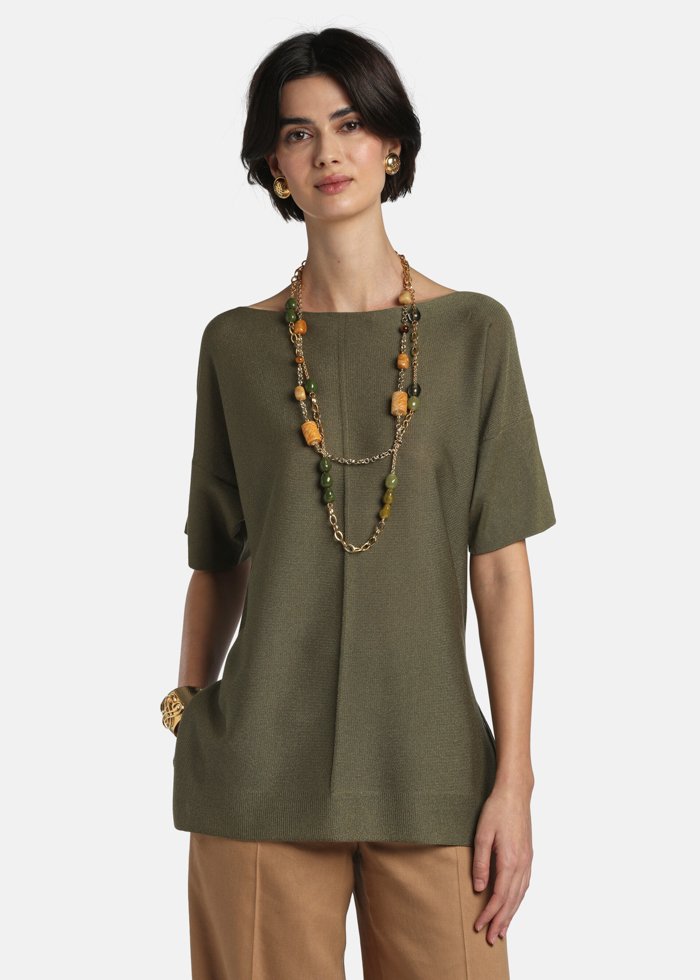 Glotnaus viskozės mišinio mezginio tunika su centrine rumbuota detale. Modelis su „boat“ tipo iškirpte, nuleistais pečiais ir iki alkūnių siekiančiomis rankovėmis.