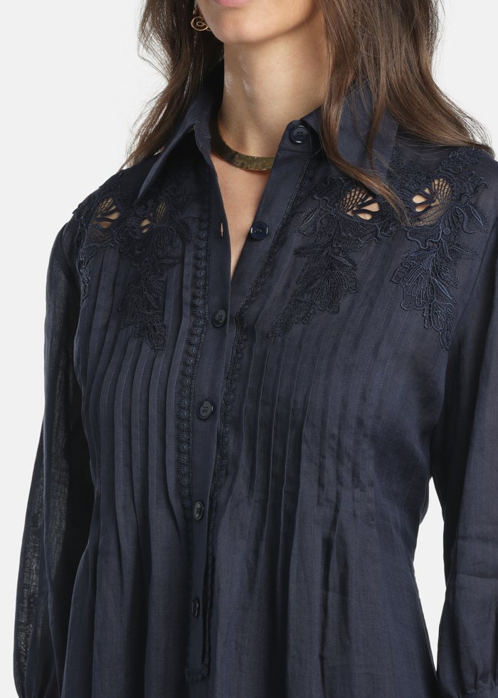 Tunikos tipo ilga suknelė iš ramės, dekoruota siuvinėtomis aplikacijomis ir dekoratyvinėmis juostelėmis. Modelis su marškinių apykakle ir pusine sagų juosta, klostėmis, šoninėmis kišenėmis bei trijų ketvirčių ilgio rankovėmis su struktūruotais rankogaliais.