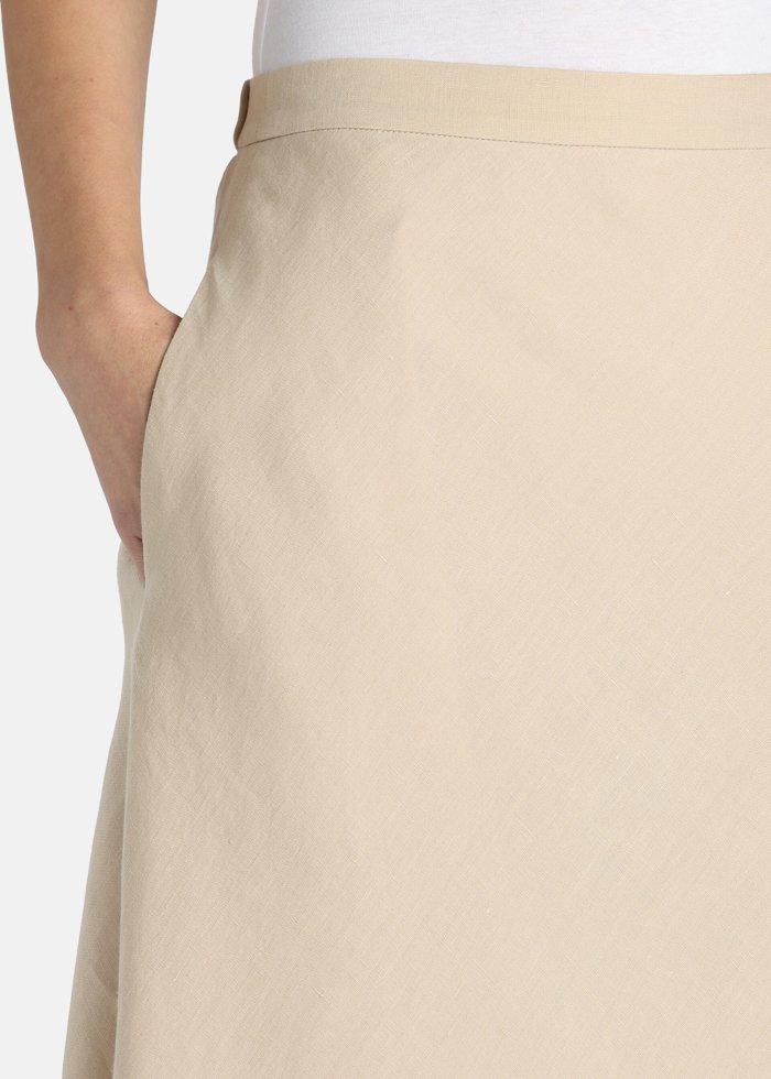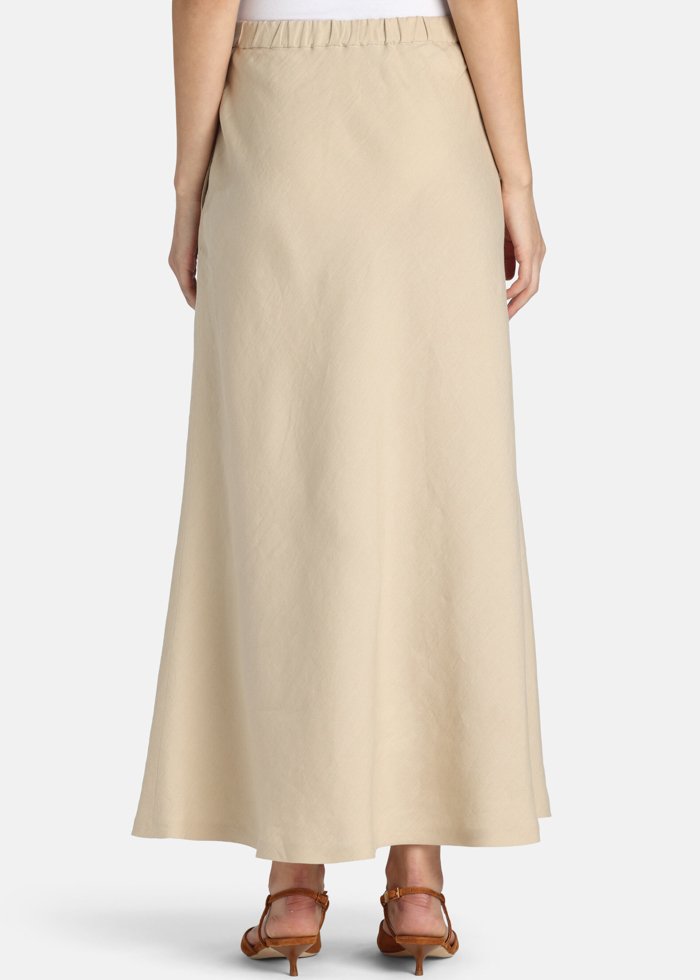 Ilgas sijonas iš gryno lino, platėjančio silueto. Modelis su šoninėmis kišenėmis ir juosmeniu su elastine juosta nugaroje, užtikrinančia patogumą. Ilgis – iki žemės.