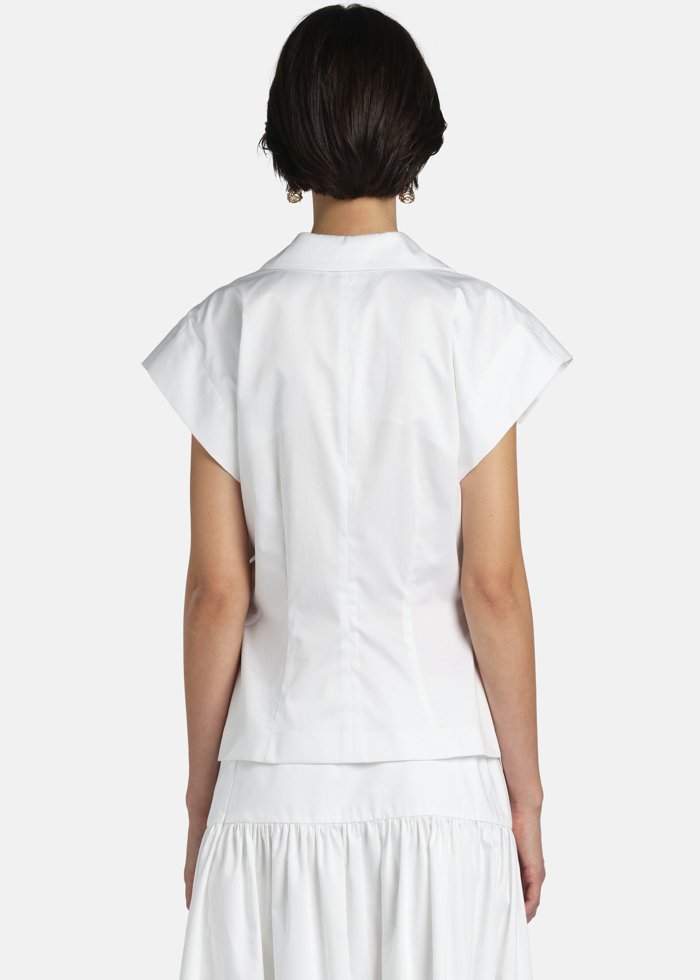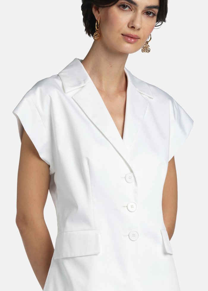 Palaidinė iš grynos medvilnės su trumpomis „cap“ tipo rankovėmis ir įkirptais atlapais. Vienaeilis modelis su derančios spalvos saga, kišenėmis su atvartais ir lengvai pabrėžtu liemeniu, suteikiančiu moteriško silueto.