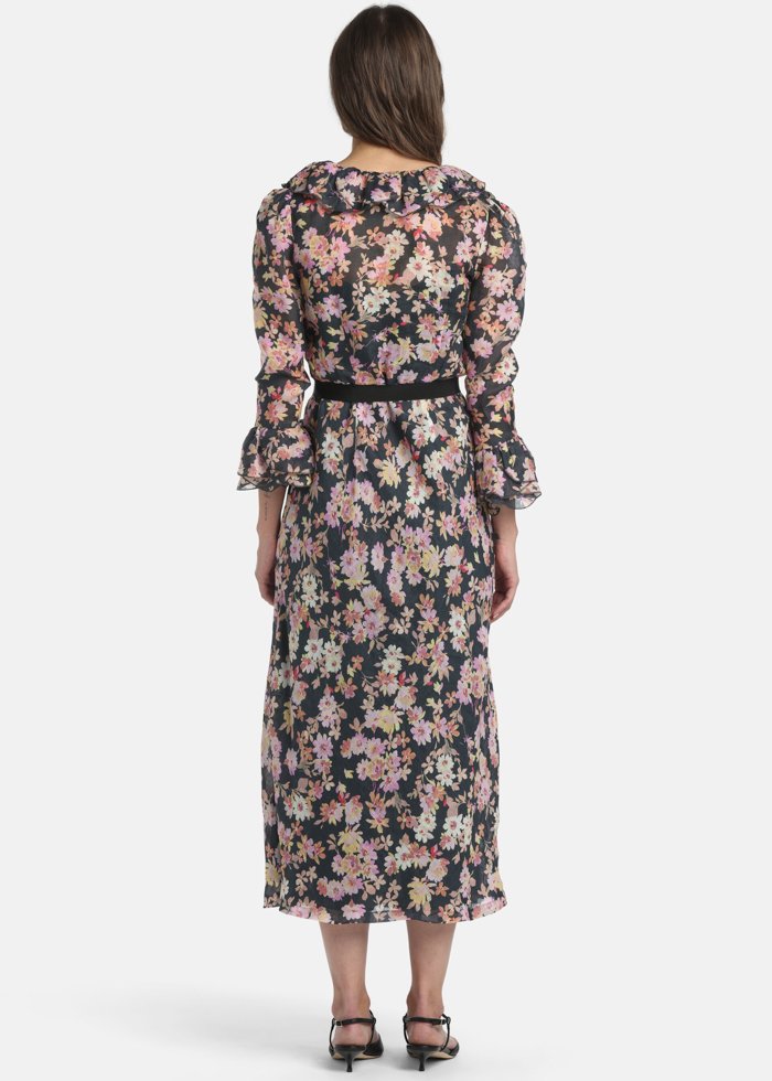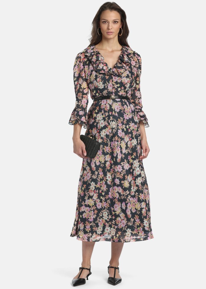 Elegantiška ramės suknelė su subtiliu gėlių raštu, V formos iškirpte ir žiedlapių formos raukiniais ties rankogaliais bei apačia. Modelis su rišamu diržu liemeniui pabrėžti ir paslėptomis sagomis.