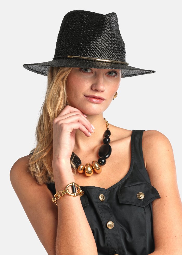 Pinta rafijos „fedora“ tipo skrybėlė su plačiu kraštu ir lašo formos viršumi. Modelis papuoštas odine virvele bei aukso spalvos metaline detale, suteikiančia subtilaus išskirtinumo.