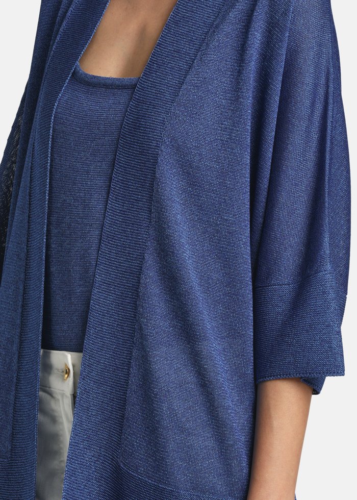 Dekonstruoto dizaino ilgas kardiganas iš viskozės mišinio, su šališku tipo apykakle ir plačiomis trijų ketvirčių ilgio rankovėmis be rankogalių sagų.