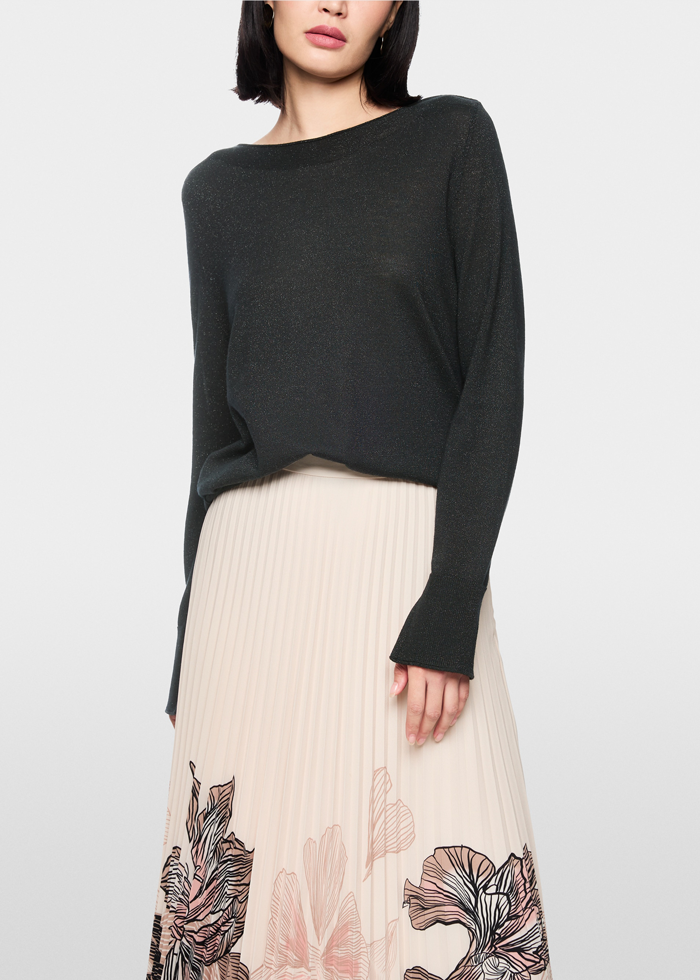 Juodos spalvos blizgus laisvo silueto megztinis ilgomis rankovėmis. Apvali kaklo iškirptė.