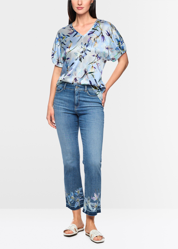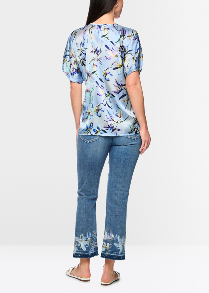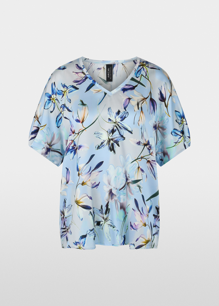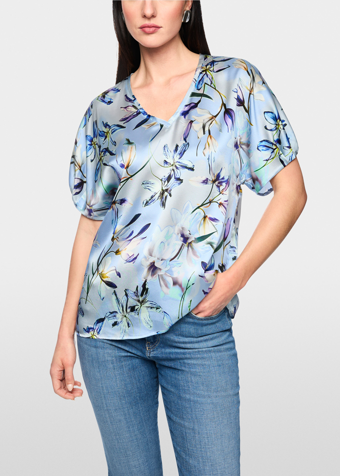 Marga šilko audinio palaidinė trumpomis rankovėmis. V formos kaklo iškirptė. Laisvas siluetas.