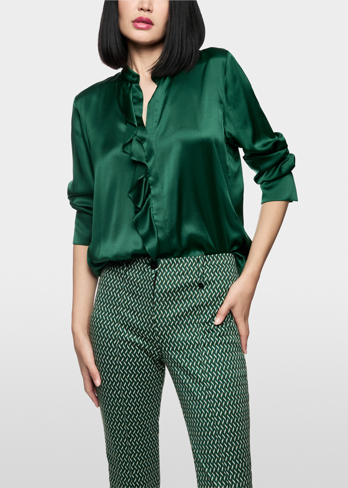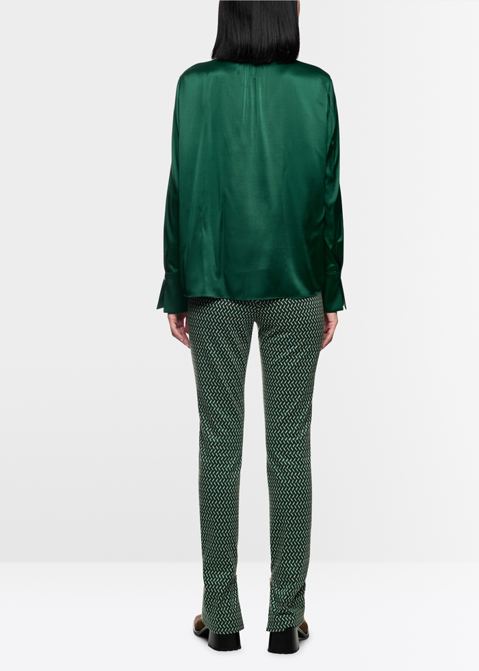 Šilko audinio elegantiška žalia palaidinė ilgomis rankovėmis. Dekoruota puošnia detale. Paslėpta sagų juosta.