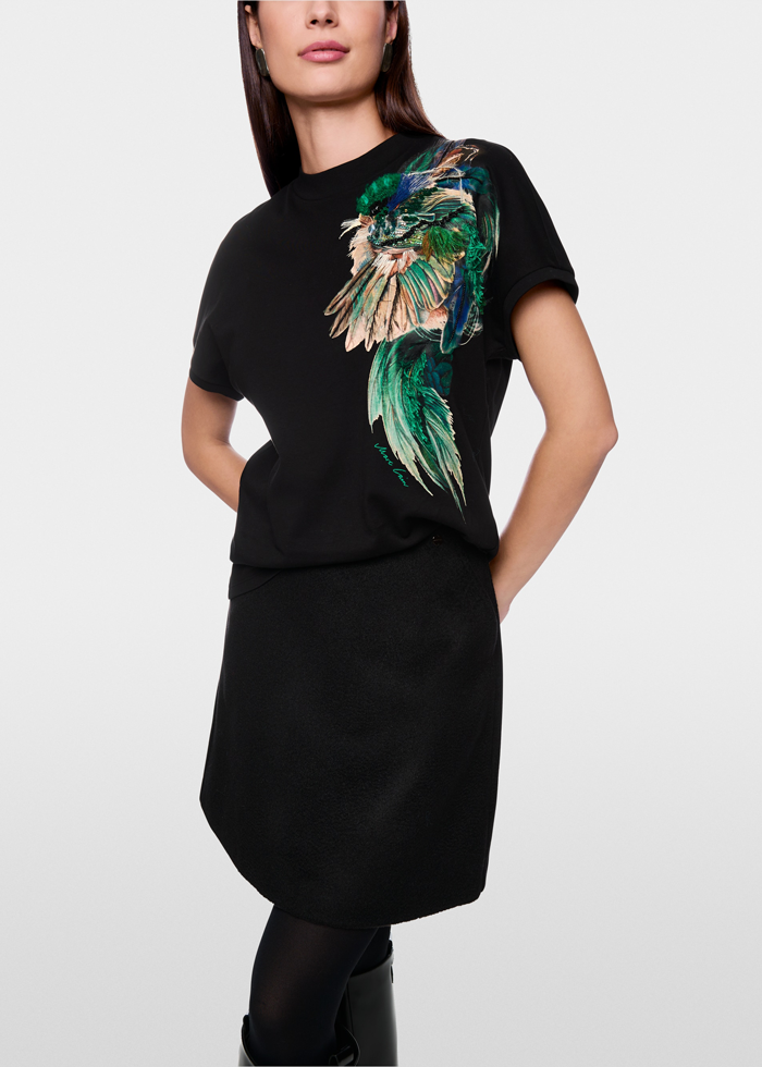 Juodos spalvos medvilniniai marškinėliai trumpomis rankovėmis. Aplikacija priekyje.