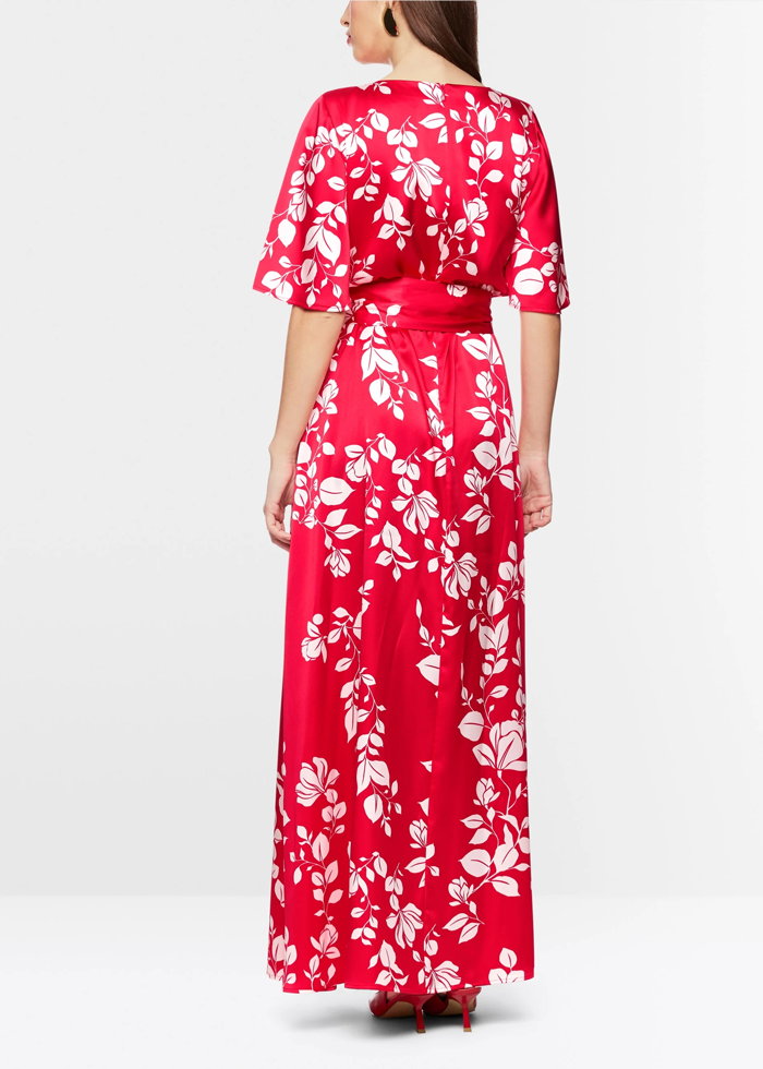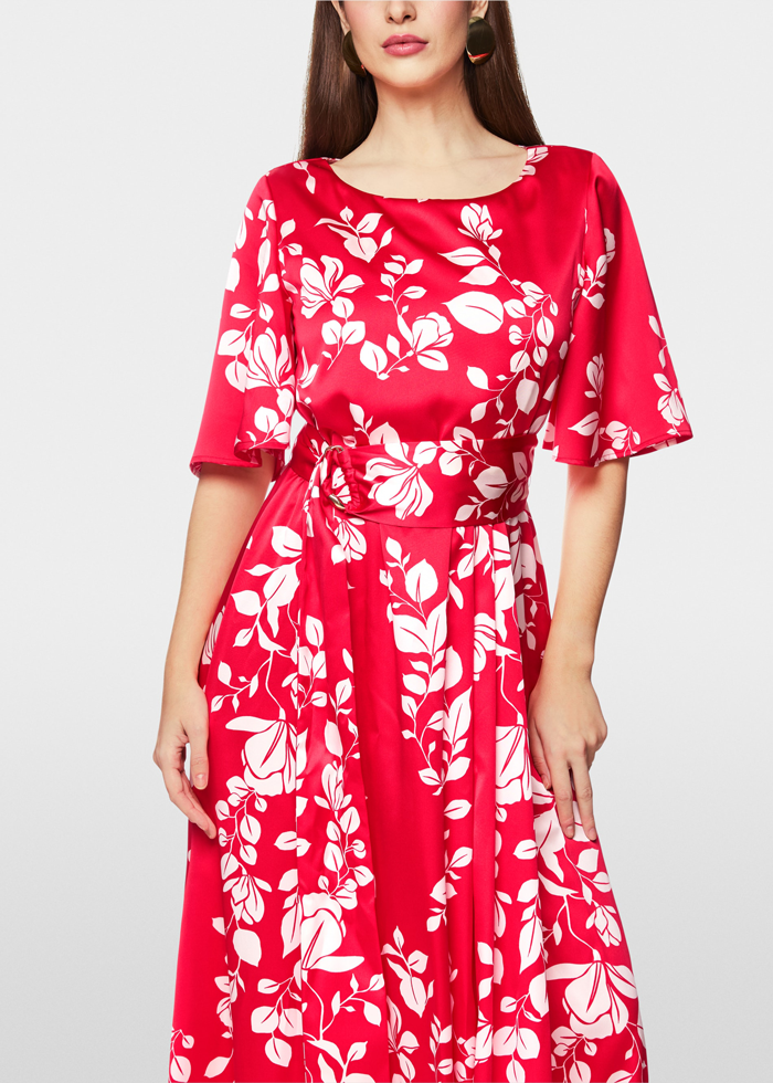 Marga gėlėta ilga suknelė trumpomis plačiomis rankovėmis. Apvali kaklo iškirptė. Užsegama užtrauktuku. Sujuosiama diržu.
