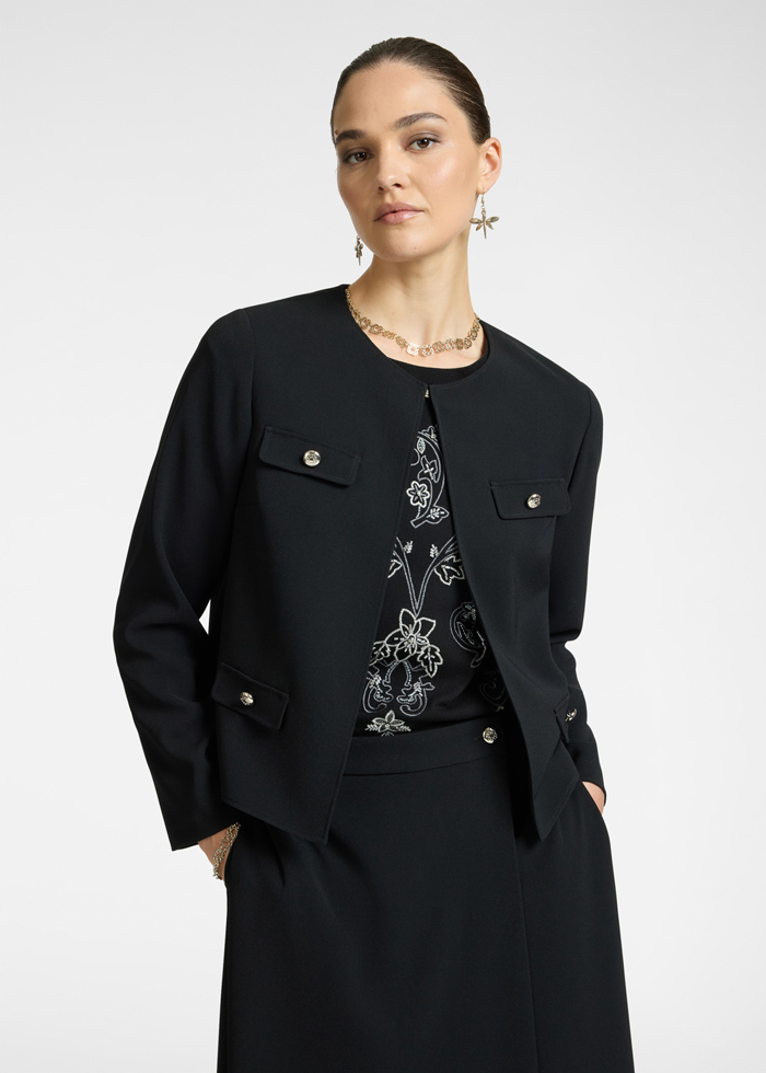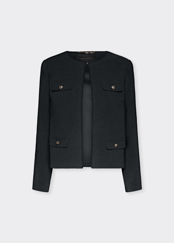 Margintas elegantiškas trumpo modelio švarkas ilgomis rankovėmis. Standus audinys. Su pamušalu.