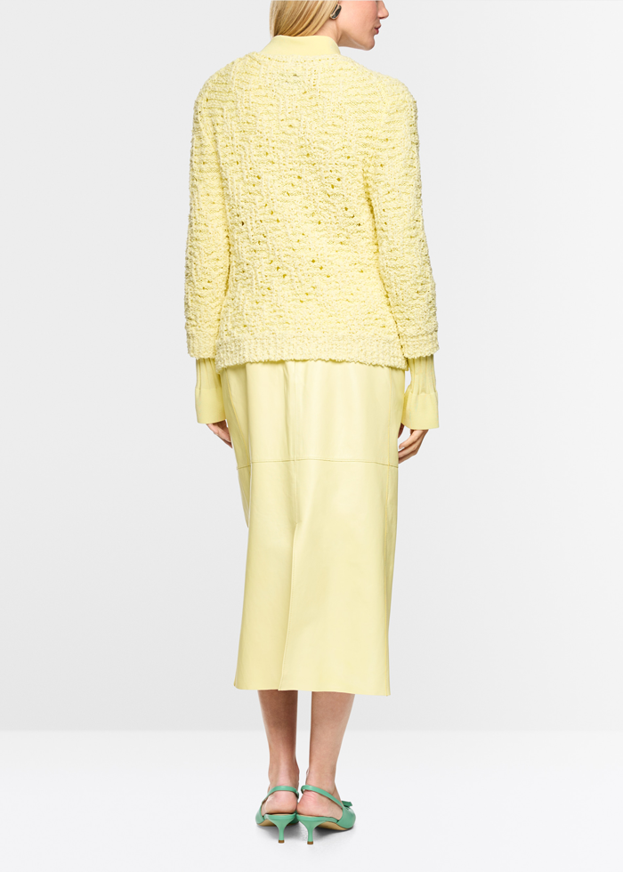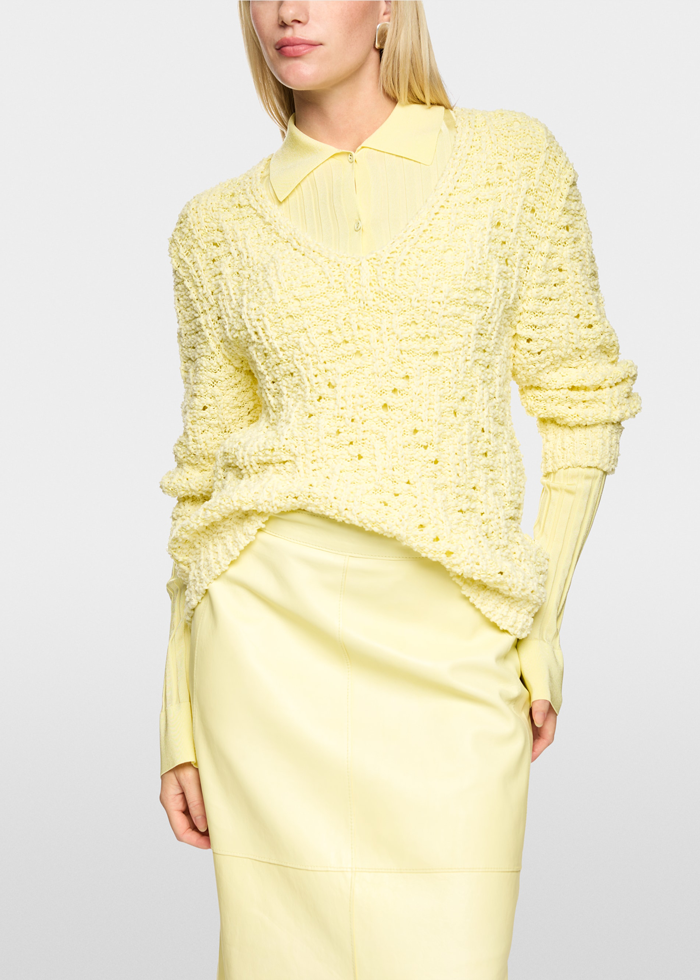Pastelinės geltonos spalvos megztinis ilgomis rankovėmis. V formos kaklo iškirptė. Laisvas siluetas.