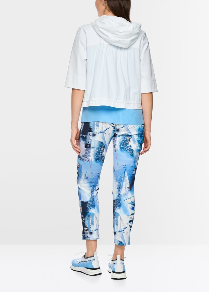 Trumpas švarkelis iš sportiško skirtingų medžiagų derinio. Modelis plataus, laisvo silueto su trumpintomis rankovėmis. Gobtuvas ir nugaros dalis pasiūti iš kiek plonesnės medžiagos. Praktinės detalės – šoninės kišenės ir reguliuojamas raištelis apačioje. Užsegama spaudžių juosta. Klasikinis pasirinkimas kasdieniam dėvėjimui.