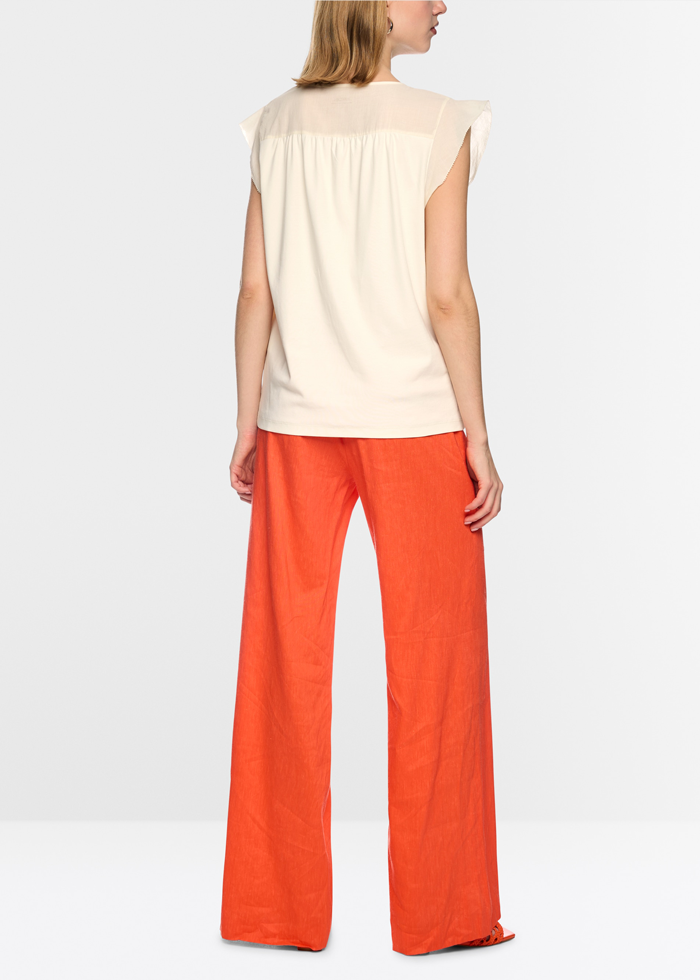 Laisvo silueto palaidinė iš patogios tamprios medvilnės trumpomis rankovėmis, suteikiančiomis moteriško lengvumo. Ant pečių ir viršutinėje nugaros dalyje esantys audinio intarpai kuria įdomų medžiagų kontrastą. Lengvas, patogus ir lengvai derinamas kasdieniams įvaizdžiams.