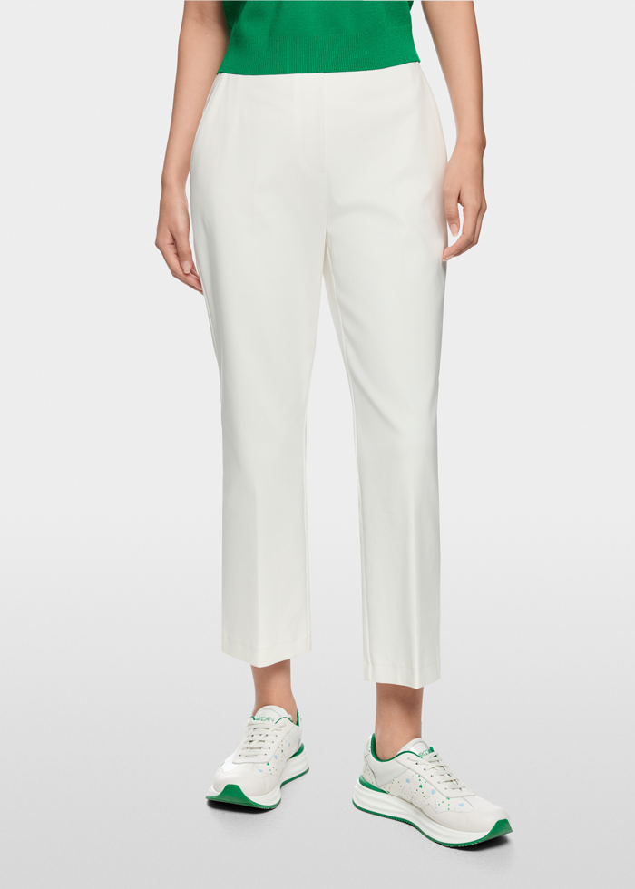 Baltos spalvos kelnės. Aukštas juosmuo. Užsegamos užtrauktuku. Kišenės.