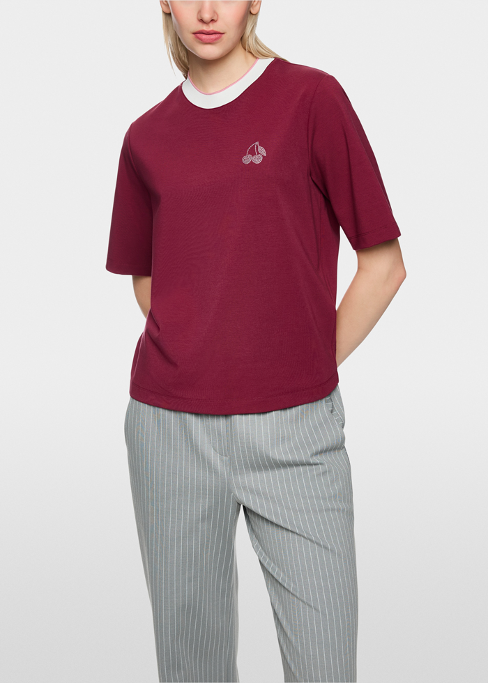 Burgundiškos spalvos laisvo silueto marškinėliai trumpomis rankovėmis. Apvali kaklo iškirptė.