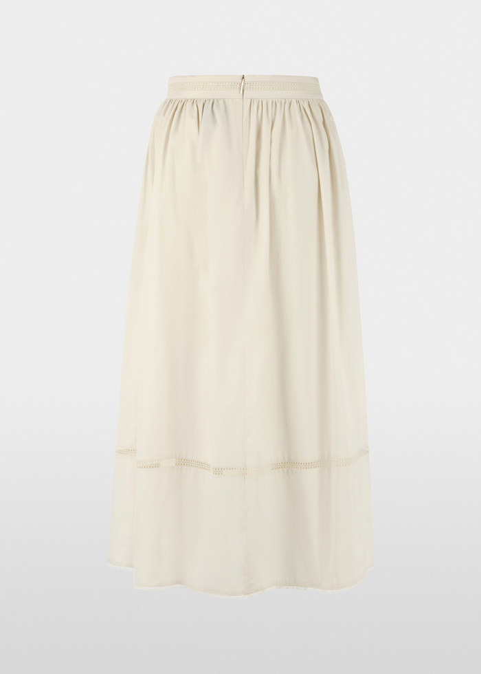 Platėjantis maksi ilgio sijonas iš lengvo medvilnės mišinio, dekoruotas subtiliomis nėrinių detalėmis, suteikiančiomis moteriško žavesio. Šoninės kišenės daro šį modelį praktišką kasdienai, o gale esantis paslėptas užtrauktukas padeda išlaikyti elegantišką siluetą.