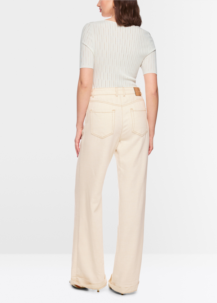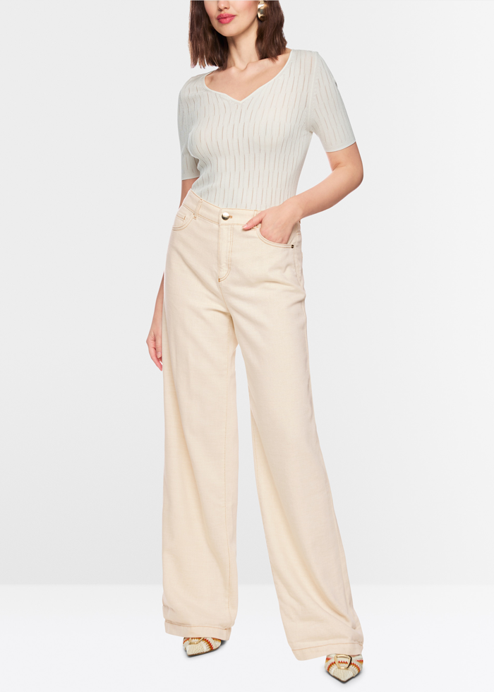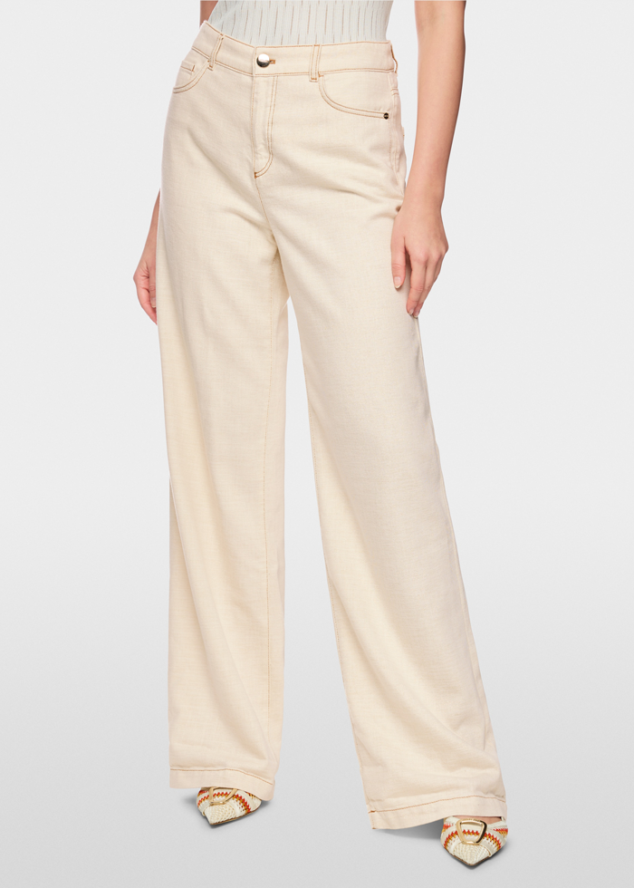 „WARRI“ džinsai išsiskiria plačiu siluetu ir aukštu liemeniu, suteikiančiu modernų įvaizdį. Medvilnės ir viskozės mišinio audinys su elastanu užtikrina optimalų komfortą. Auksinės kontrastinės siūlės ir subtiliai žvilgantis liurekso siūlas tampa elegantiškais akcentais. Klasikinis penkių kišenių modelis su monetų kišene, diržo kilpomis, užtrauktuku ir blizgia logotipo saga užbaigia dizainą.