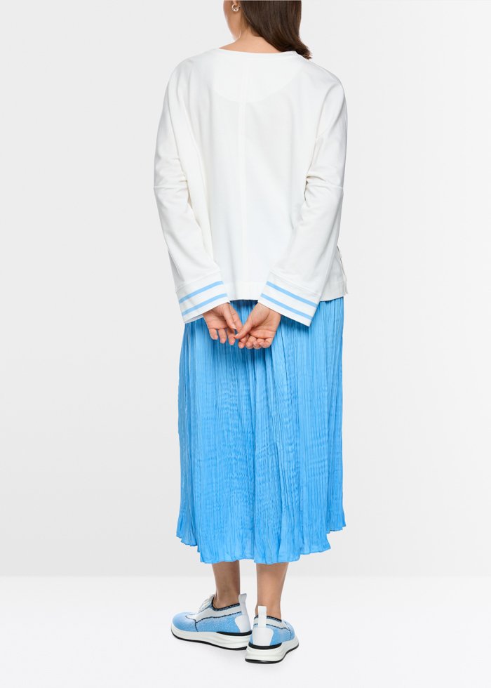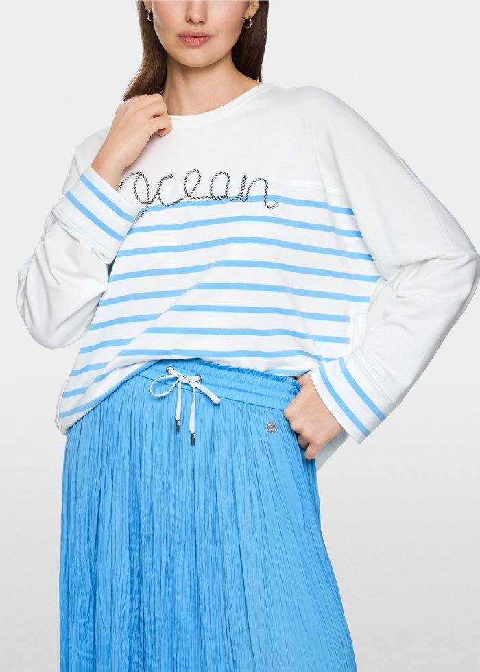 Laisvo silueto džemperis su nuleistais pečiais ir apvalia iškirpte. Išskirtinumo suteikia dryžuotas raštas ir priekyje esantis „Ocean“ siuvinėjimas, kuriantis subtilų jūrinį įvaizdį. Minkštas audinio mišinys maloniai priglunda prie odos ir užtikrina komfortą. Papildoma detalė – nedideli šoniniai skeltukai su sagomis.
