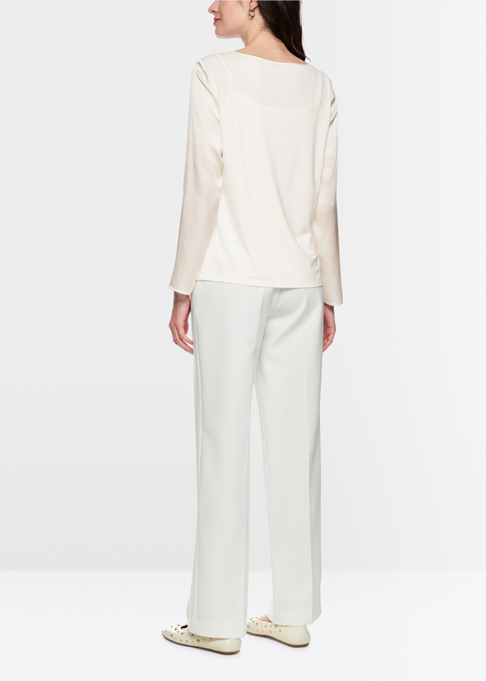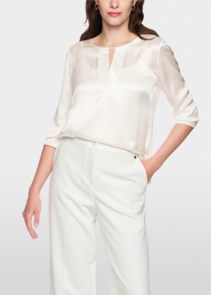 Baltos spalvos laisvo silueto elegantiška šilko audinio palaidinė ilgomis rankovėmis. Apvali kaklo iškirptė. Skeltukai šonuose.