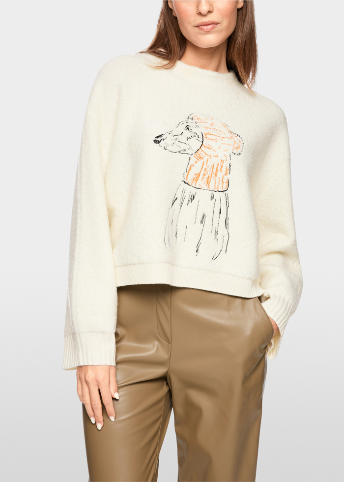 Šviesios spalvos laisvo silueto megztinis ilgomis rankovėmis. Apvali kaklo iškirptė. Šuns paveikslo motyvas.