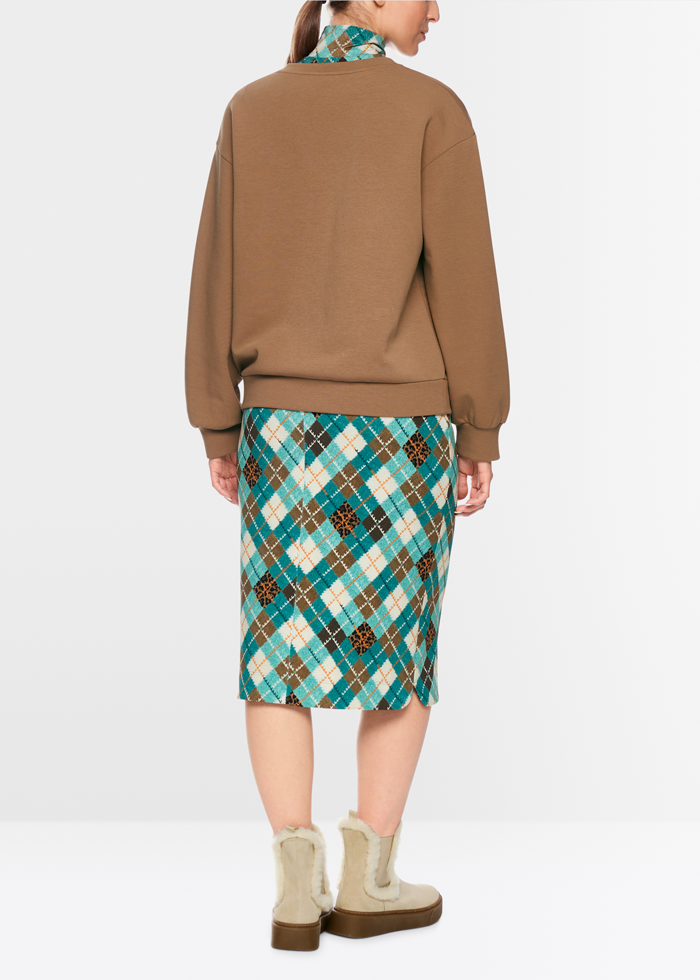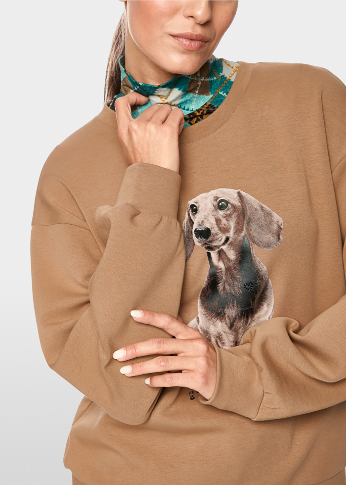 Rudos spalvos laisvo silueto džemperis ilgomis rankovėmis. Apvali kaklo iškirptė. Šuns piešinio aplikacija.