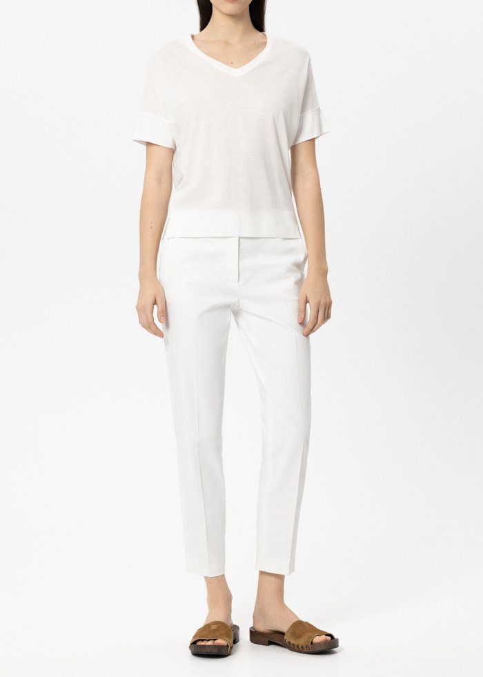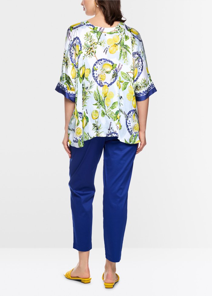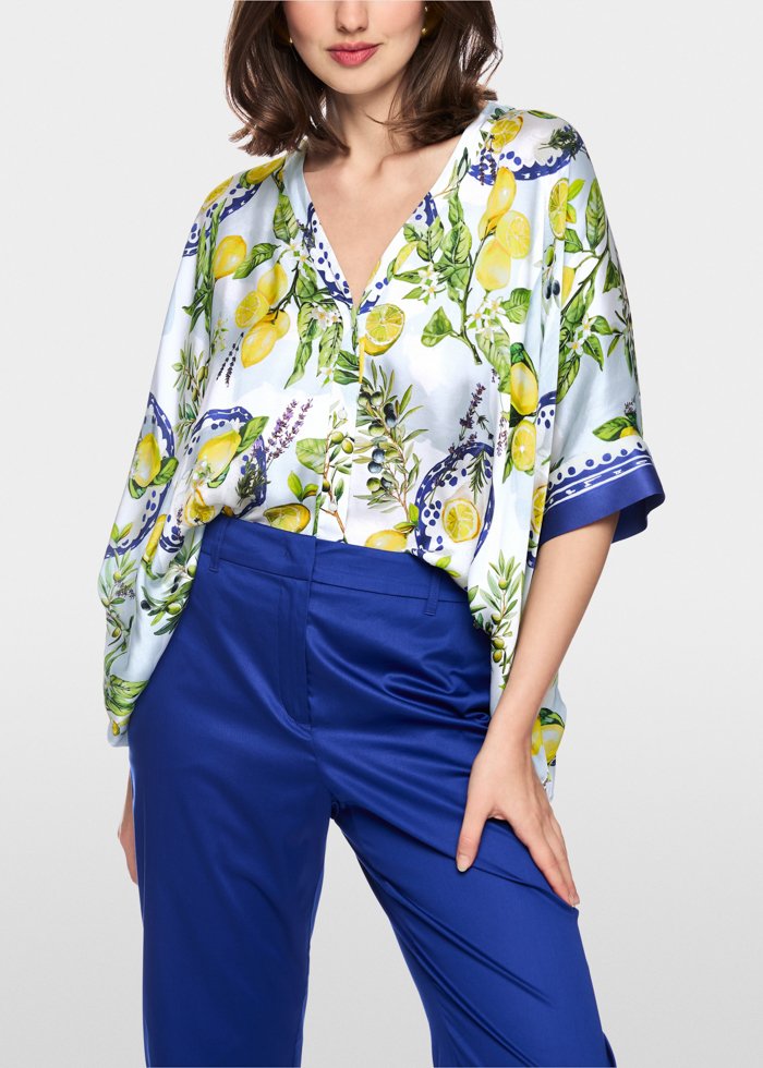 Laisvo silueto palaidinė iš grynos, lengvai krentančios viskozės, maloniai priglundančios prie kūno. Viduržemio jūros įkvėptas citrinų ir alyvuogių raštas suteikia modeliui išskirtinumo ir vasariško žavesio. Trijų ketvirčių ilgio rankovės, V formos iškirptė ir per visą ilgį einanti sagų juosta su dekoratyvinėmis sagomis pabrėžia moterišką siluetą.