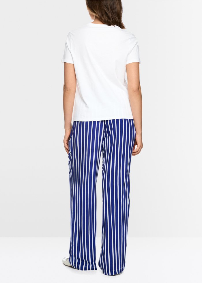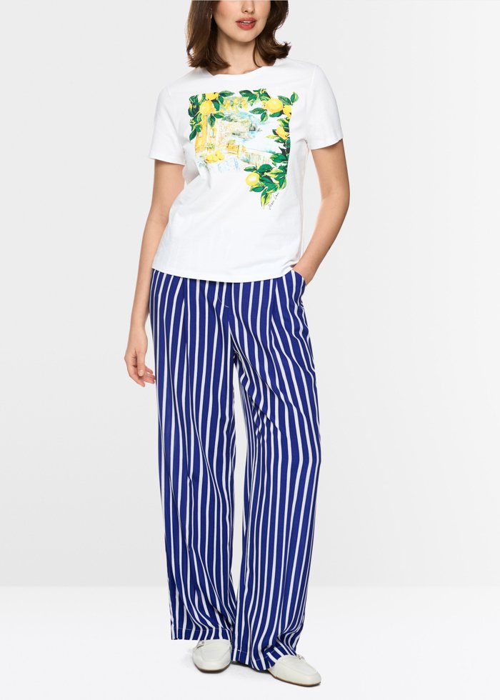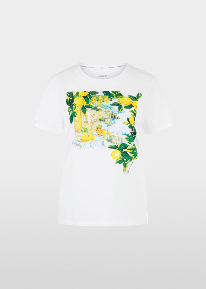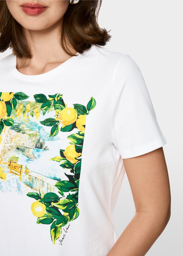 Laisvo silueto marškinėliai iš 100 % medvilnės, pasižymintys minkštu pojūčiu. Išraiškingas raštas, derinantis gaivias citrinas ir Viduržemio jūros peizažą, suteikia modeliui vasariško gaivumo, o smulkūs žvyneliai ir mini perliukai – subtilaus žvilgesio.