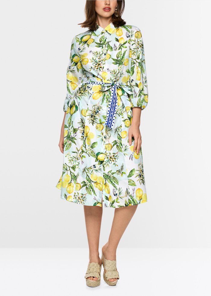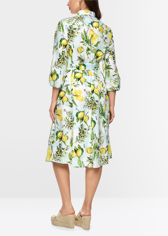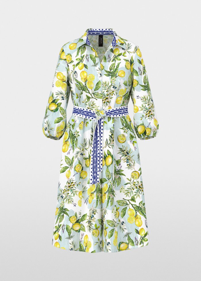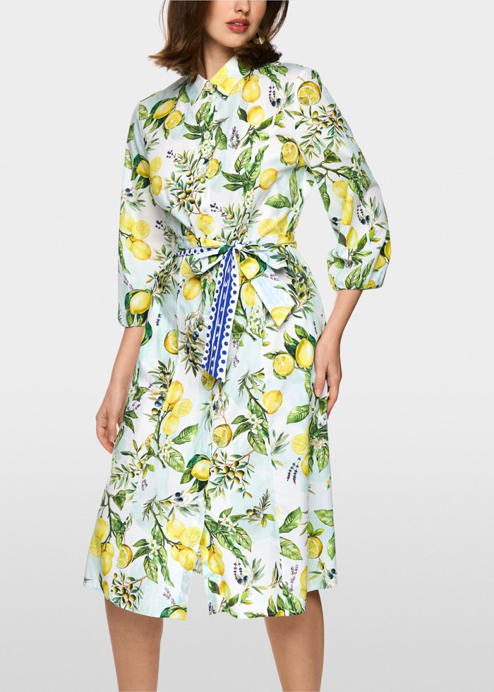Midi ilgio suknelė iš medvilnės, dekoruota vasarišku citrinų ir alyvuogių raštu. Lengvai krentantis sijonas ir per visą ilgį einanti sagų juosta suteikia klasikinių elegancijos bruožų. Trijų ketvirčių rankovės su subtiliais raukiniais ties rankogaliais ir derantis rišamas diržas pabrėžia liemenį, o šoninės kišenės suteikia praktiškumo.