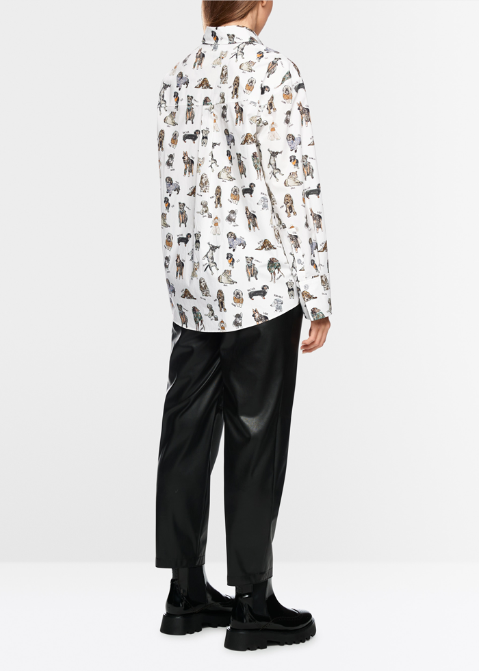 Baltos spalvos margi laisvo silueto medvilniniai marškiniai ilgomis rankovėmis. Šunų aplikacijos.