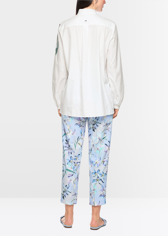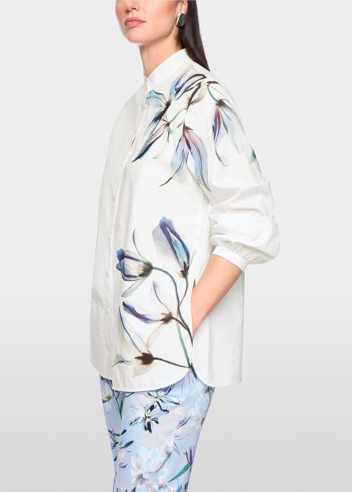 Baltos spalvos medvilniniai marškiniai ilgomis rankovėmis. Prailgintas laisvas siluetas. Kontrastingas piešinys.