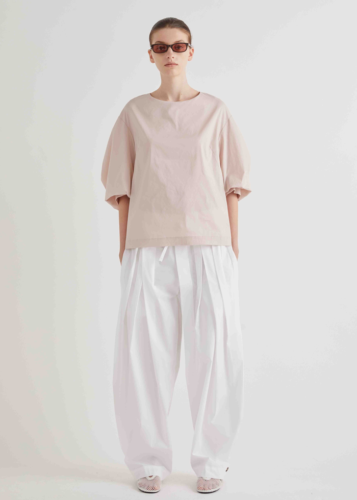 Švelniai rožinės spalvos laisvo silueto palaidinė atvira nugara. Apvali kaklo iškirptė. Nuleista pečių linija.