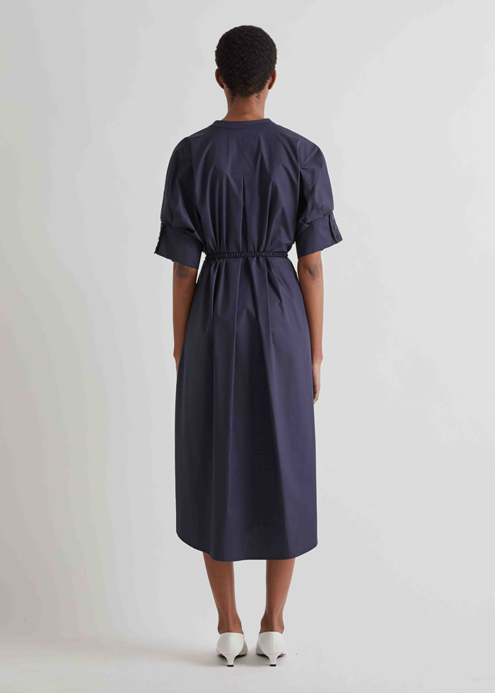 Tamsiai mėlynos spalvos midi ilgio elegantiška suknelė trumpomis rankovėmis. V formos kaklo iškirptė. Sujuosiamas juosmuo.