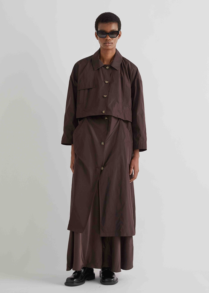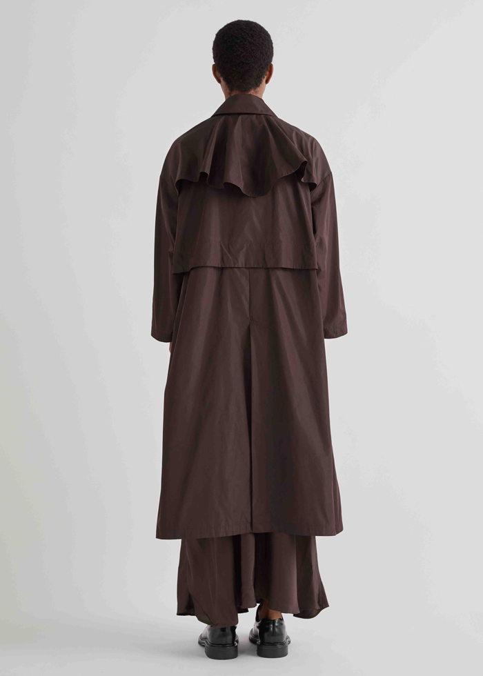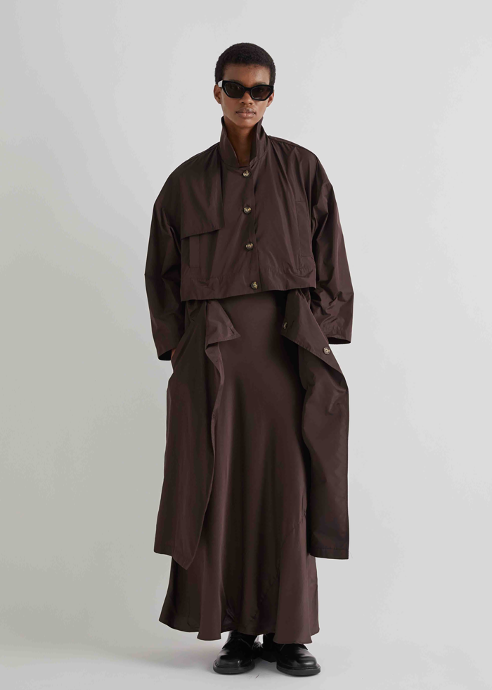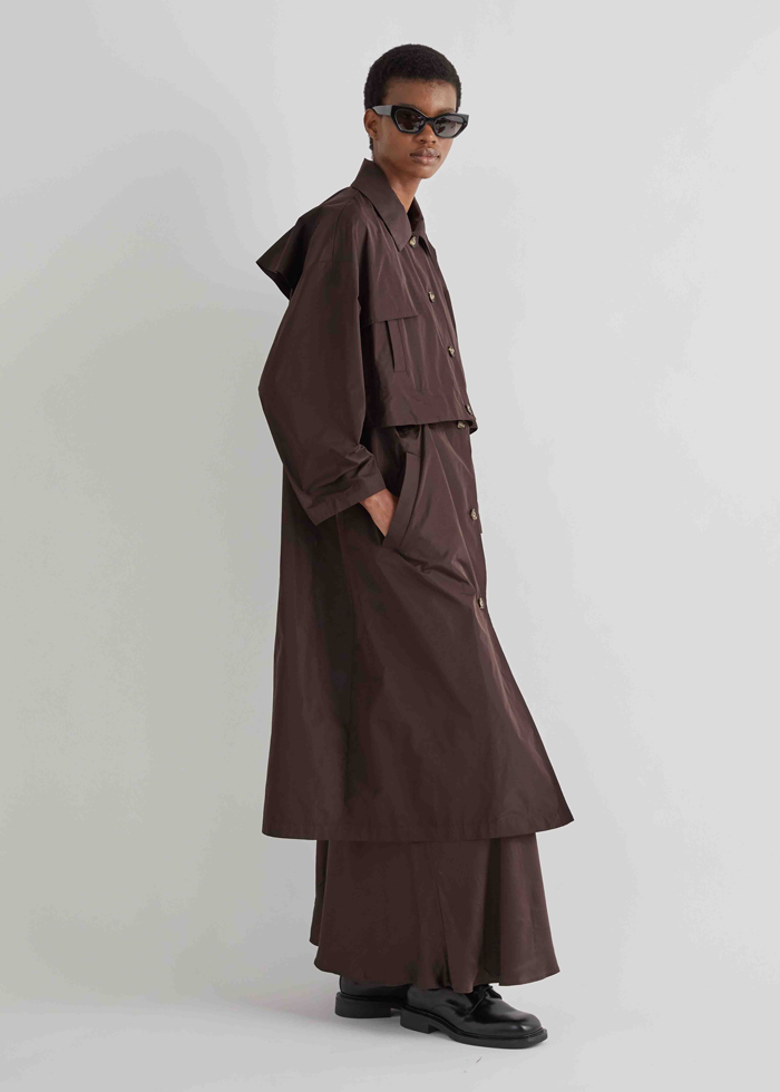 Tamsiai rudos spalvos stilingas ilgas lietpaltis ilgomis rankovėmis. Susegamas sagomis. Kišenės.