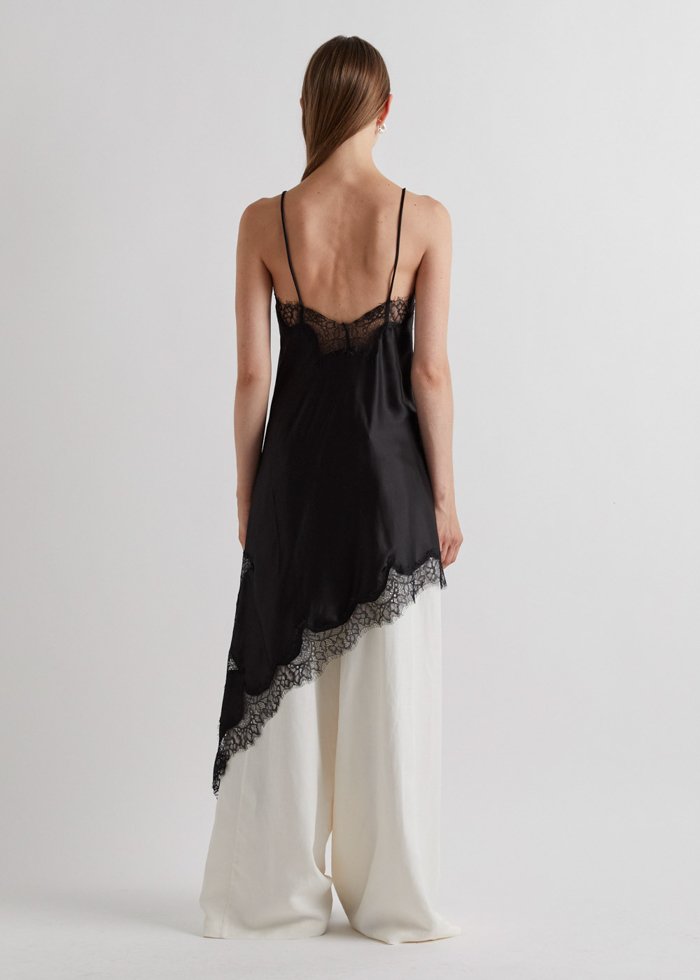Ilga, lengvai krentanti suknelė plonomis petnešėlėmis su nėrinių detalėmis. Asimetriškas siluetas suteikia elegancijos ir išskirtinumo. Subtilus ir moteriškas modelis, puikiai tinkantis tiek ypatingoms progoms, tiek išskirtiniams deriniams.