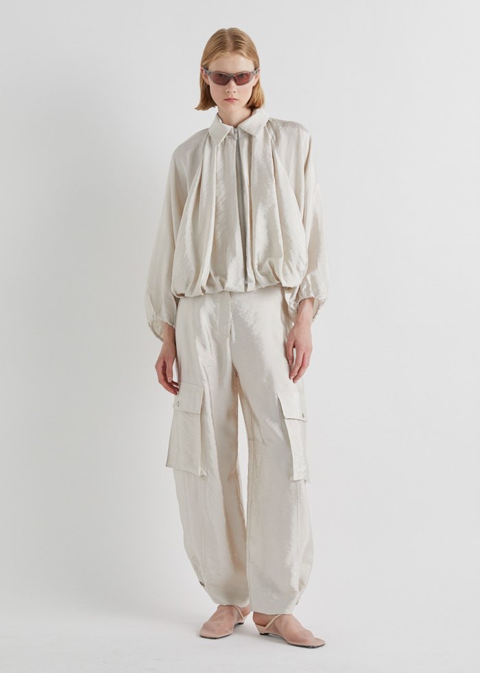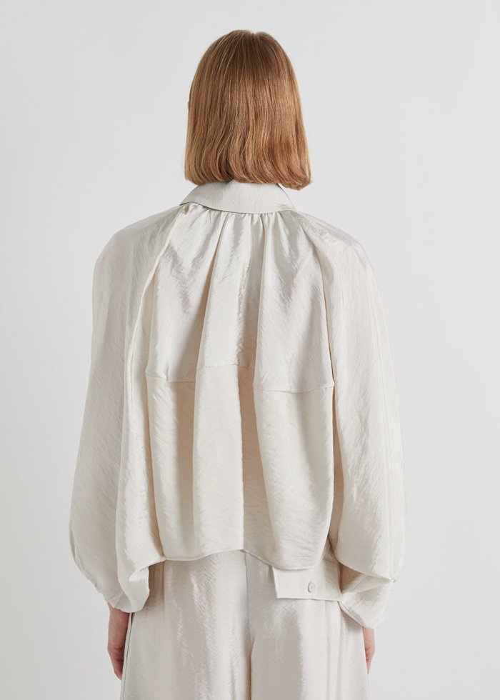 Laisvo silueto lengva striukė su užtrauktuku ir klasikine apykakle. Pūstos rankovės su elastiniais rankogaliais suteikia apimties ir modernumo. Švelniai žvilgantis audinys kuria elegantišką, tačiau lengvai kasdienai pritaikomą įvaizdį.