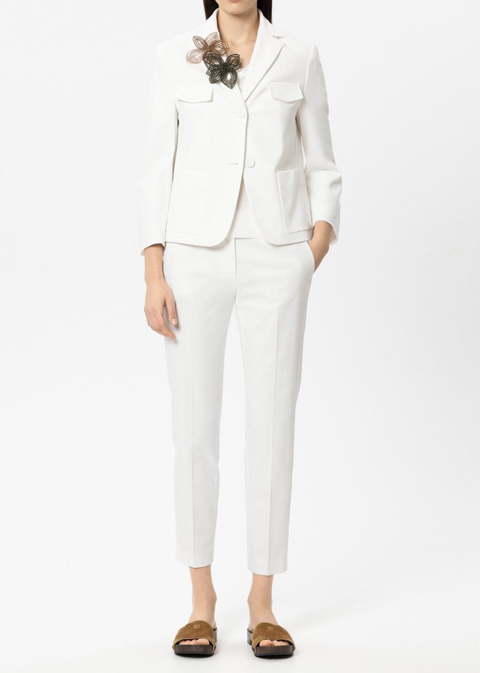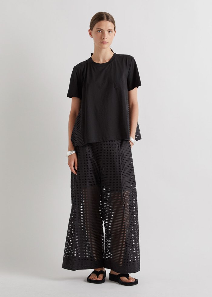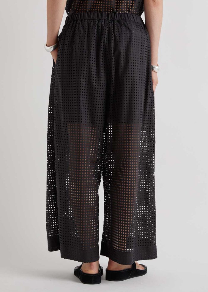 Plačių klešnių kelnės su perforuotu raštu, suteikiančiu lengvumo ir išskirtinumo. Aukštesnis juosmuo ir struktūruotas siluetas kuria modernų, elegantišką įvaizdį.