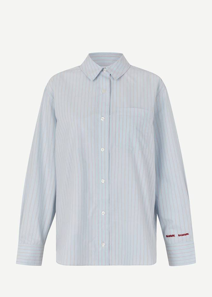 Akvamarini spalvos laisvo silueto marškiniai ilgomis rankovėmis. Kišenės priekyje. Prailgintos rankovės su sidabro spalvos logotipais. Nuleista pečių juosta.